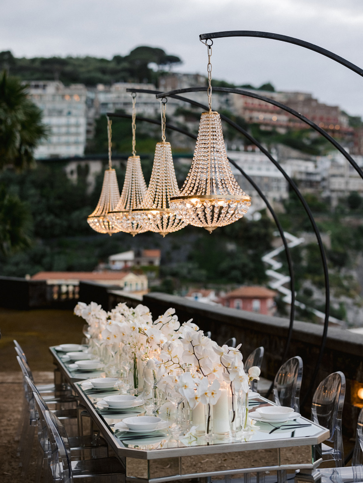 Fulvia e Ascanio desideravano sposarsi con la sola famiglia e hanno coronato il loro sogno a Sorrento, in una antica villa di lusso, con una bellissima vista sul mare della costiera. Location immersa nel verde con un panorama incredibile e molti angoli che ricordano il suo ricco passato. Le composizioni floreali di un bianco cangiante e i lampadari di swaroski hanno contornato il tutto rendendolo ancora più elegante e sofisticato.